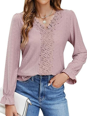 Lace Detail Eyelet V-Neck Flounce Sleeve Blouse