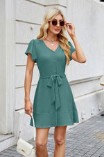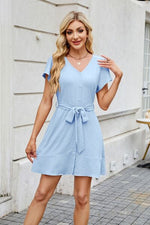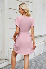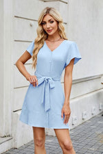 Tied Button Up Short Sleeve Mini Shirt Dress