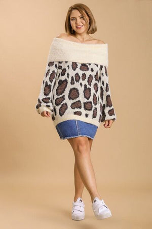 Umgee Full Size Leopard Off-Shoulder Long Sleeve Sweater