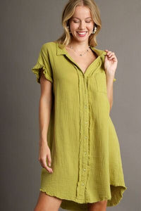 A raw hem button-down short-sleeve gauze shirt dress is a stylish and versatile piece that offers comfort and ease of wearing. The raw hem adds a trendy, casual touch, while the button-down design allows for adjustable styling options. This dress is made of gauze fabric, which is lightweight and breathable, making it perfect for warmer weather.