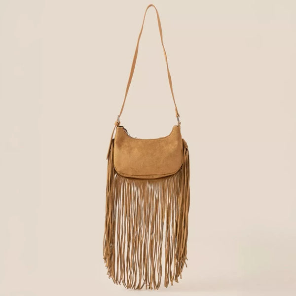 The Suede Fringe Crossbody Bag is a stylish and bohemian accessory to elevate your outfit. Crafted from luxurious suede material, this bag offers a touch of sophistication and texture. The fringe detailing adds a playful and trendy element to the design. With its crossbody style, it allows for hands-free convenience while on the go. Perfect for adding a touch of Western flair to your ensemble, this bag is versatile and chic. Make a fashion statement with the Suede Fringe Crossbody Bag and add a touch of flair to your look.