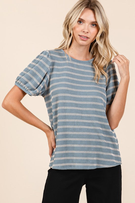 The Striped Short Puff Sleeve Knit Top is a charming and feminine piece that adds a touch of whimsy to any outfit. Featuring classic stripes, this top exudes a timeless and versatile appeal. The short puff sleeves add a playful and romantic flair, perfect for adding a stylish detail to your look. Crafted from knit fabric, this top offers a comfortable and flattering fit. Pair it with high-waisted jeans or a skirt for a chic and casual ensemble that is perfect for various occasions. Embrace a playful yet elegant style with the Striped Short Puff Sleeve Knit Top as a delightful addition to your wardrobe.