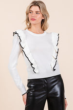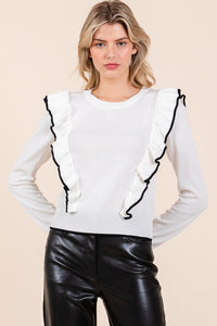 The Contrast Trim Ruffled Round Neck Knit Top combines a classic round neck design with stylish ruffled detailing and contrasting trim. The ruffles add a feminine touch to the top, while the contrast trim adds visual interest and a modern twist. The knit fabric ensures comfort and a versatile look that can be dressed up or down for various occasions.