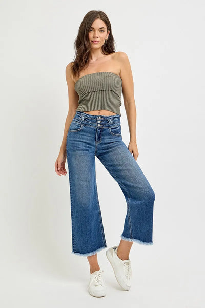 RISEN High Rise Crop Wide Leg Jeans with Wide Band Detail