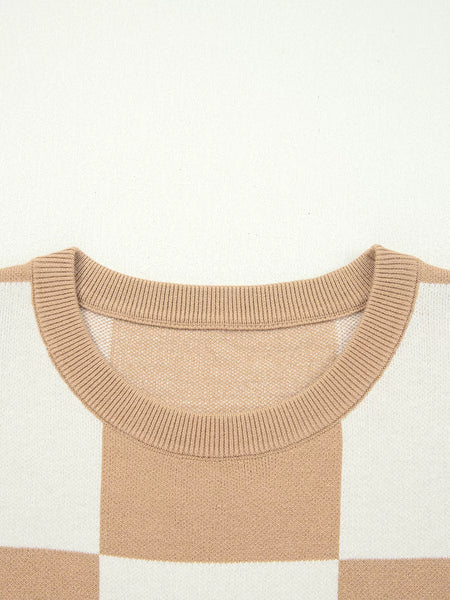 Checkered Pattern Loose Drop Shoulder Half Sleeve Sweater
