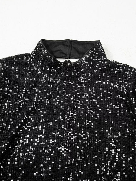 Sequin Mock Neck Drape Open Back Bell Sleeve Top