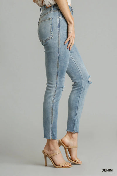 These 5-Pockets Distressed Detail Stretch Denim Skinny Jeans with Unfinished Hem are a trendy and edgy addition to your denim collection. The distressed detailing adds a worn-in and stylish look. The stretch denim fabric provides comfort and flexibility for all-day wear. The unfinished hem adds a modern and raw touch to the classic skinny jeans silhouette.