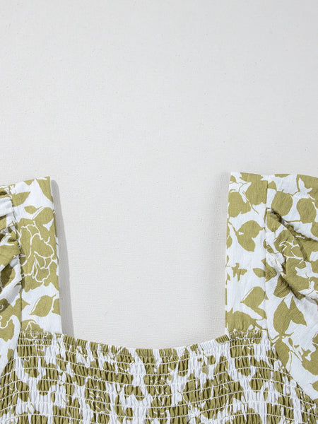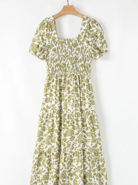 Boho Floral Square Neck Smocked Bust Puff Sleeve Tiered Dress