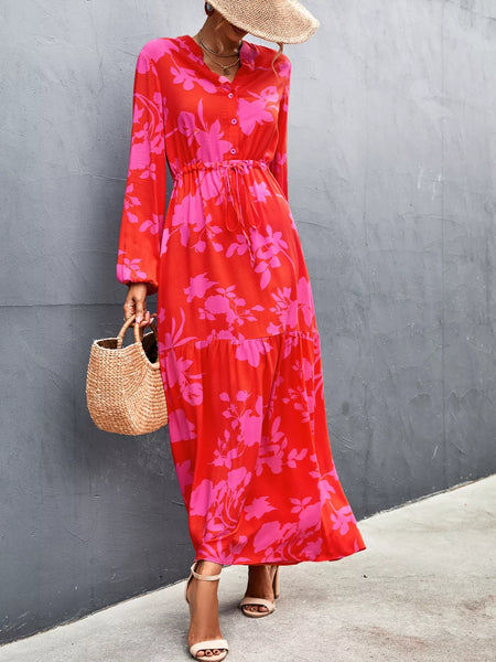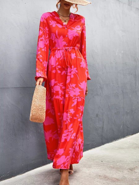 Floral Drawstring Waist Long Sleeve Maxi Dress