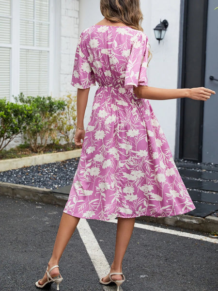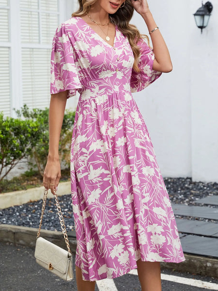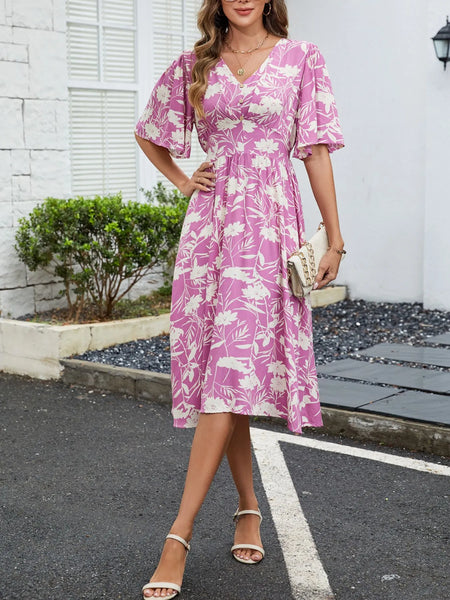 Floral Flutter Sleeve V-Neck Summer Midi Dress