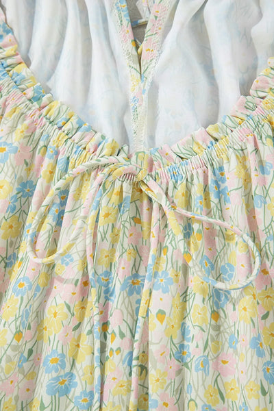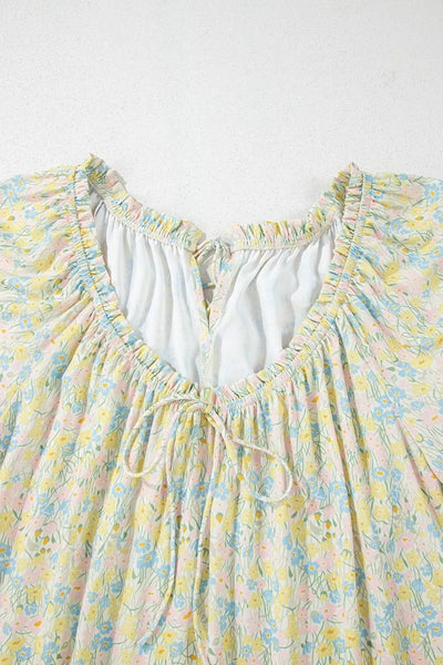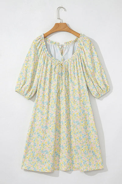 Floral Half Sleeve Frilled U Neck A-line Short Dress