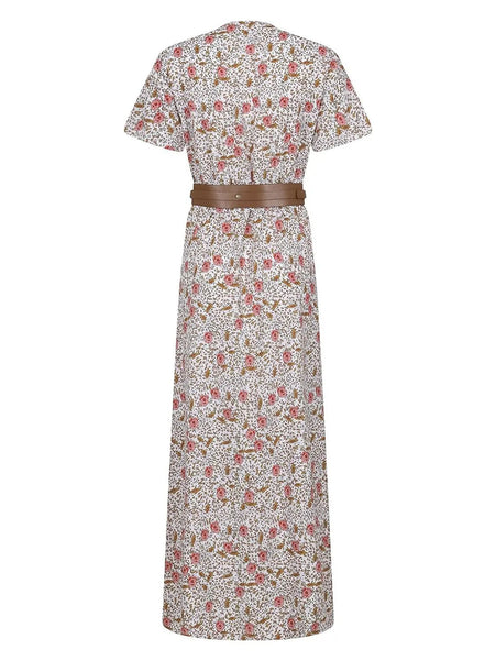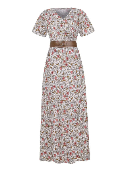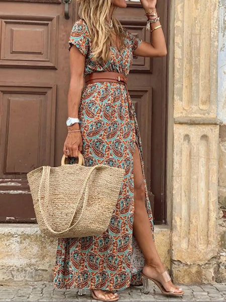 Full Size Printed V-Neck Short Sleeve Maxi Dress
