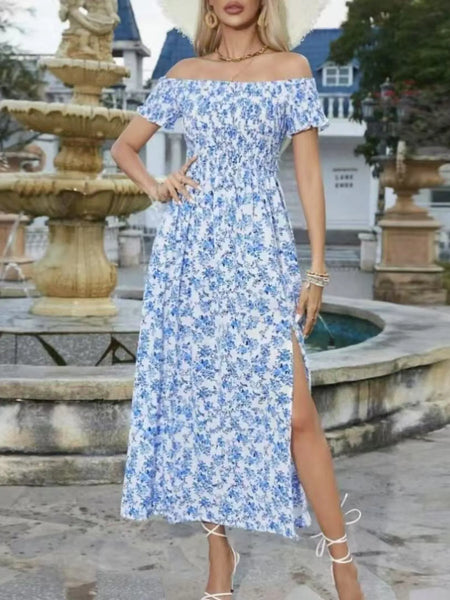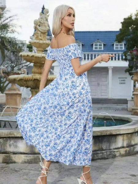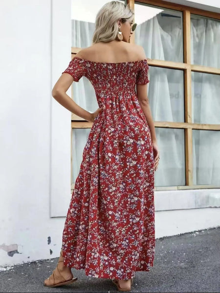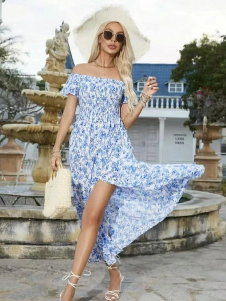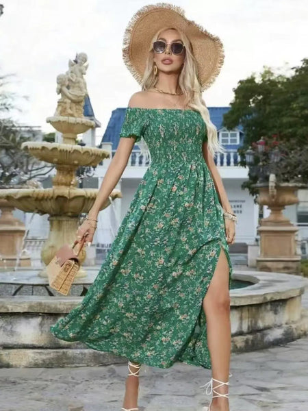This stunning Full Size Slit Off-Shoulder Floral Midi Dress combines bohemian elegance with modern comfort. Crafted from lightweight, breathable fabric perfect for warm weather, it features an alluring off-shoulder neckline with elastic band for secure fit. The delicate floral print adds feminine charm while the strategic side slit provides both style and movement. The midi length offers versatility for various occasions, from casual beach days to summer parties. Designed with plus size inclusivity in mind, this dress flatters all body types with its flowy A-line silhouette. The pull-on design ensures effortless dressing, making it a perfect choice for vacation wear, date nights, or casual outings.