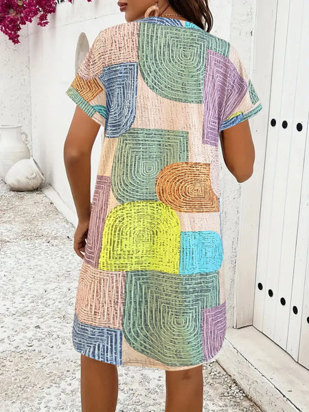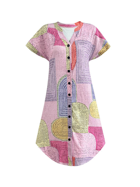 Geometric V-Neck Short Sleeve Button-Front Dress