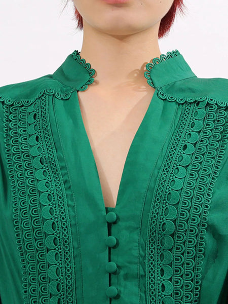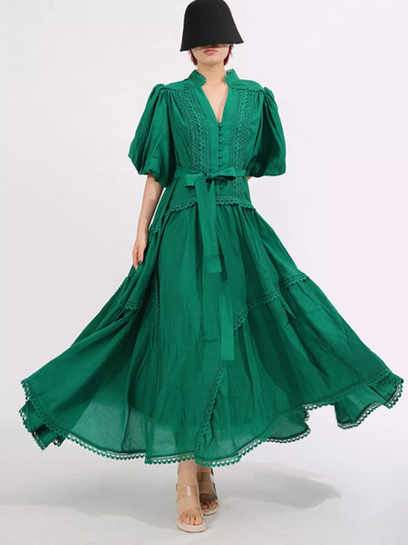 Lace Detail Notched Puff Sleeve Maxi Dress