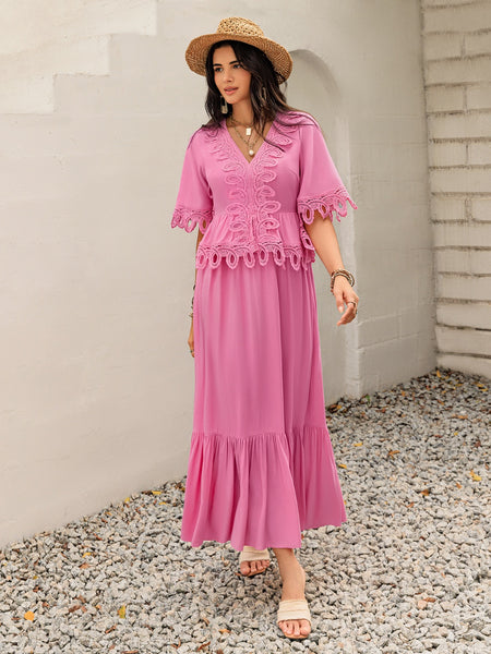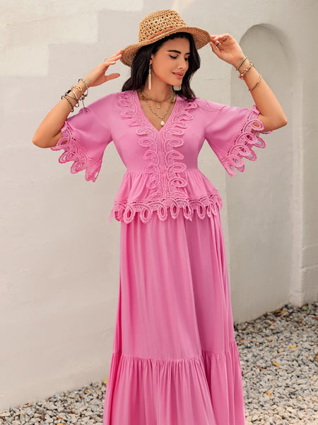 Lace Detail V-Neck Half Sleeve Midi Dress