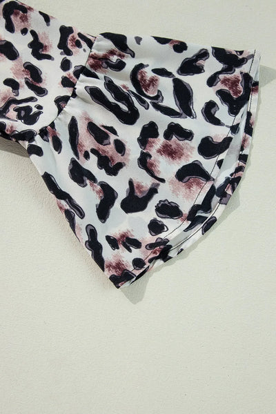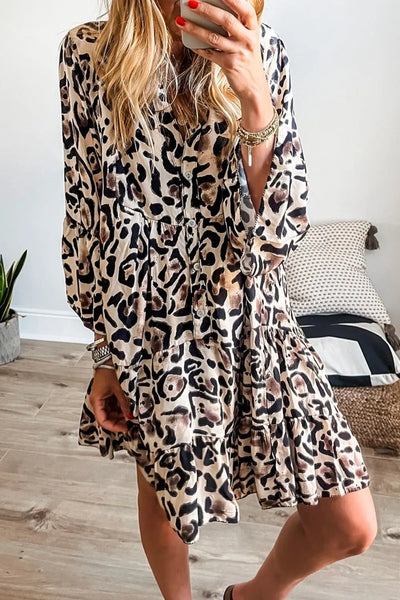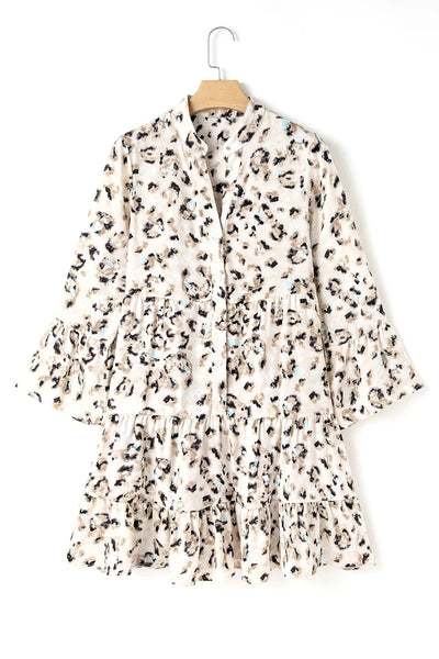 Leopard Print Buttoned Front 3/4 Sleeve Tiered Ruffled Hem Dress