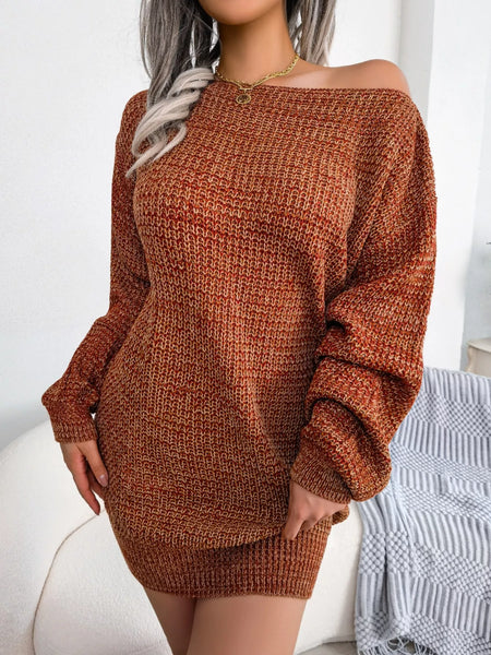This vibrant one-shoulder sweater dress combines bold color with a relaxed silhouette, offering a playful yet polished look that’s perfect for transitioning from day to evening wear.