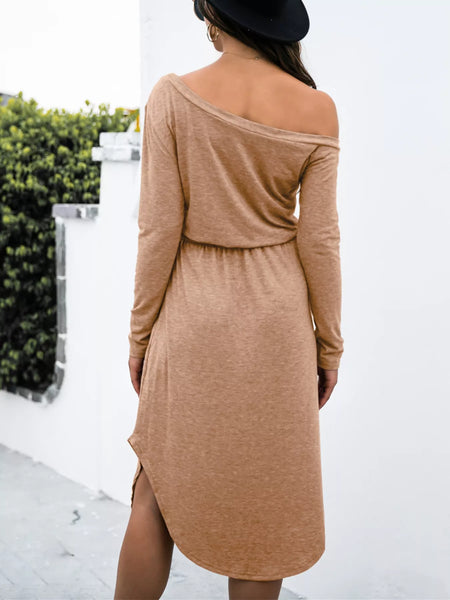 One-Shoulder Long Sleeve Midi Dress with Drawstring Waist