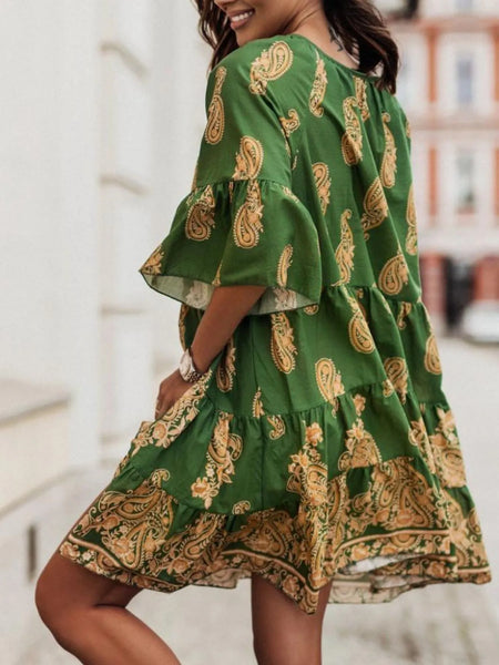 Paisley Print Tie Neck Half Sleeve Mini Dress