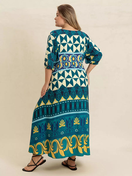 Plus Size Printed V-Neck Half Sleeve Midi Dress