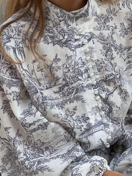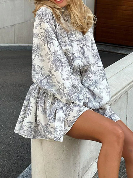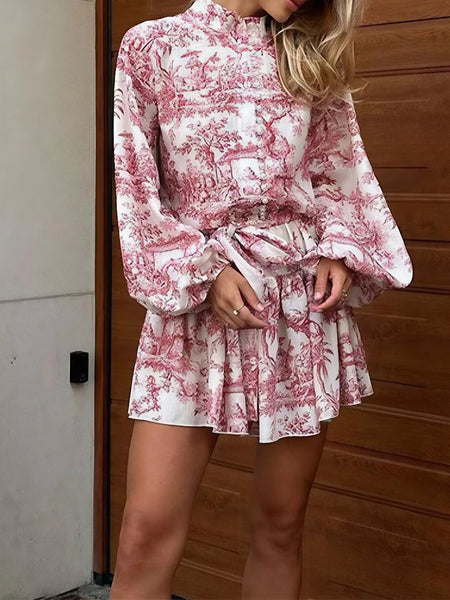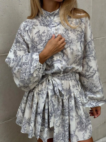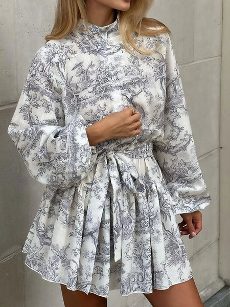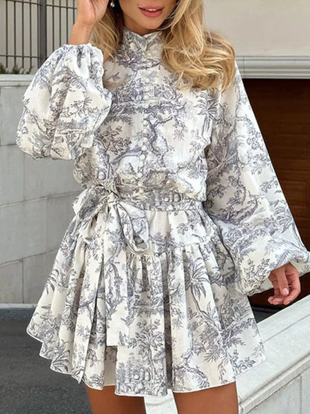 Printed Balloon Sleeve Tie Waist Dress