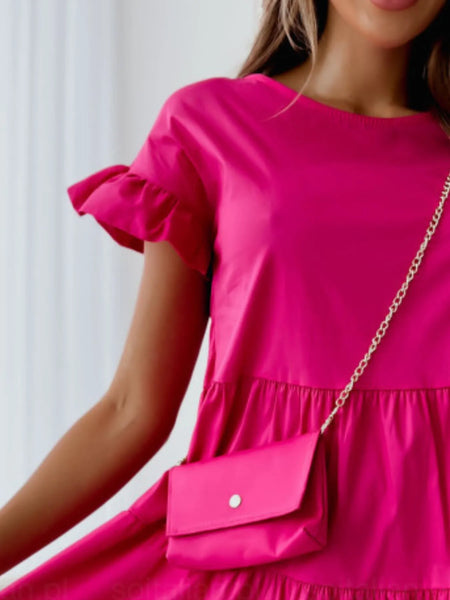This charming tiered swing dress features a flattering loose fit design in an eye-catching hot pink shade. Made from soft and breathable fabric, it showcases delicate ruffle sleeves and multiple tiered layers that create beautiful movement. The dress comes with a coordinating mini crossbody bag, making it a perfect ensemble for casual outings or summer events. The round neckline and above-knee length provide a balanced silhouette, while the pull-on style ensures easy wear. Suitable for various occasions from day to evening wear.