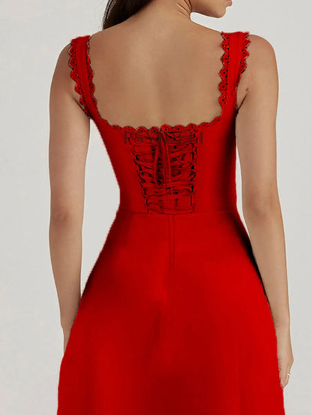 Scalloped V-Neck Midi Dress with Back Lace-Up