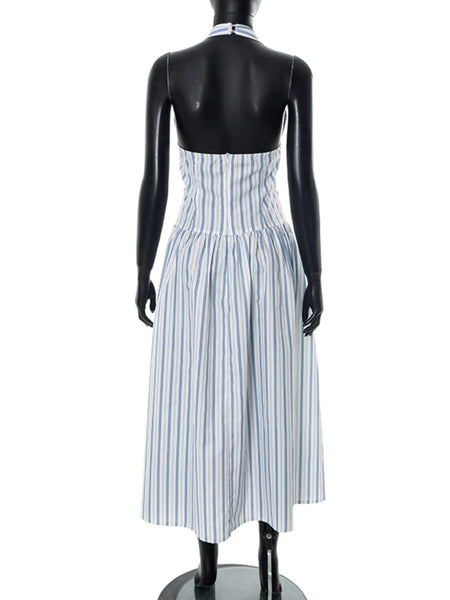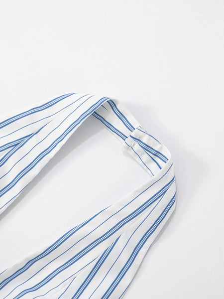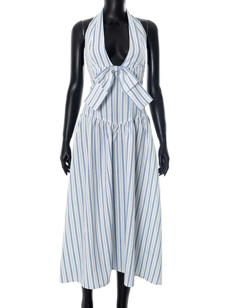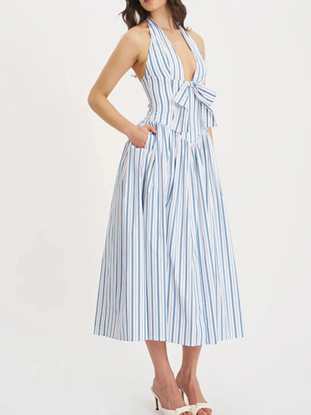 Striped Halter Neck Midi Dress with Tie Front Detail