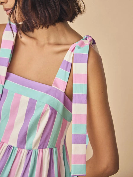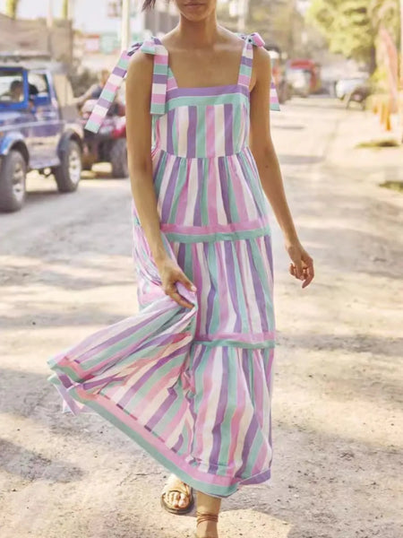 Striped Tiered Maxi Summer Dress with Bow Shoulder Ties