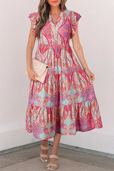 Tribal Paisley Print Ruffled Sleeve Notch Neck Midi Dress
