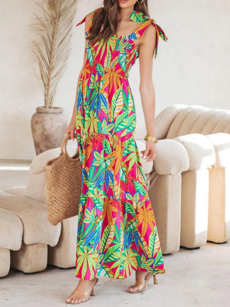 Tropical Print Tie Shoulder Maxi Dress