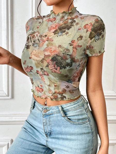 Abstract Print Ruffled Mock Neck Crop T-Shirt