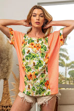 This top features a unique combination of floral print and striped color block design on dolman sleeves, creating a stylish and eye-catching look. The floral pattern adds a touch of femininity and charm, while the striped color block detailing brings a modern and dynamic element to the top. The dolman sleeves provide a relaxed and comfortable fit, perfect for everyday wear. Elevate your outfit with this trendy and versatile top that effortlessly blends floral elegance with bold stripes for a fashion-forward ensemble.
