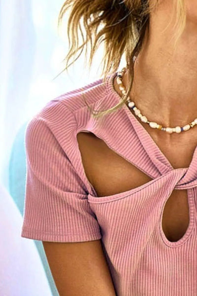The rib knit with cut out and front twist detailed top is a trendy and stylish addition to your wardrobe. The ribbed knit fabric adds texture and depth to this top, while the cut-out and front twist detailing create a unique and eye-catching design. Perfect for adding a touch of edginess to your outfit, this top is great for both casual and dressy occasions. Pair it with high-waisted jeans or a skirt for a chic and modern look. Embrace the fashion-forward and sophisticated appeal of this rib knit with cut out and front twist detailed top for a stand-out ensemble.