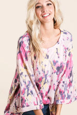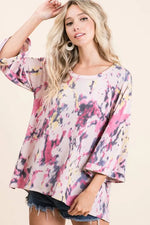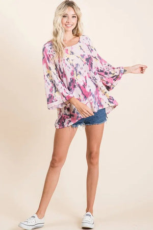 The Tie Dye Print Terry A-Line Top with Bell Sleeves is a fun and stylish addition to your wardrobe. The tie-dye print adds a pop of color and whimsy to the terry fabric. The A-line silhouette offers a flattering fit with a flowy shape. The bell sleeves add a touch of bohemian flair and movement to the top. Perfect for a casual and relaxed look, this top can be paired with jeans or leggings for a comfortable and chic outfit.