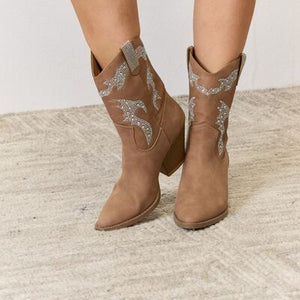 These boots exude rugged charm while offering unparalleled comfort and durability. The ankle-height design adds a modern twist to the classic cowboy style, perfect for pairing with jeans or a flowing skirt for a touch of Western flair. The sparkling rhinestones embellish the boots, catching the light with every step and making a bold statement.