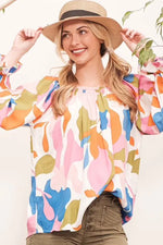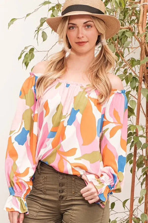 Make a bold statement with this abstract print off-the-shoulder long sleeve top. The abstract print adds a modern and artistic touch to the top. The off-the-shoulder design is chic and trendy, perfect for showcasing your shoulders. Pair with jeans or trousers for a stylish and fashion-forward look. Elevate your outfit with this unique and eye-catching top.