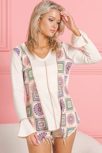 The Granny Square Print Contrast Annie Rib V-Neck Top combines a mix of vintage and modern styles for a unique and eye-catching look. The granny square print adds a retro and nostalgic touch, reminiscent of traditional crochet patterns. The contrast rib detailing on the V-neckline adds a modern and chic element to the top. This combination of design elements creates a stylish and eclectic top that can be paired with jeans or skirts for a fashion-forward outfit. Elevate your style with the Granny Square Print Contrast Annie Rib V-Neck Top for a trendy and standout ensemble.