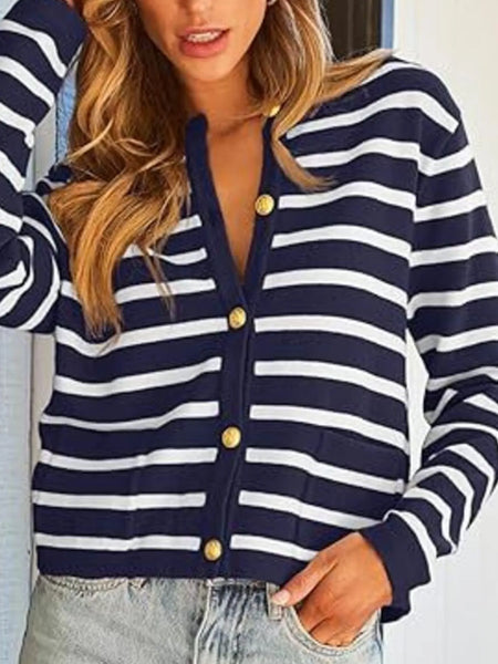 This elegant striped button-up cardigan features a timeless black and white horizontal stripe pattern that adds classic sophistication to any wardrobe. Crafted from soft, lightweight knit fabric with comfortable stretch, it offers excellent wearability and easy care maintenance. The cardigan showcases distinctive gold-tone buttons that create an elegant contrast against the monochrome stripes, while the flattering V-neck design and relaxed fit provide versatile styling options. Perfect for layering over tanks, tees, or dresses, this piece transitions seamlessly from casual to semi-formal occasions. The ribbed cuffs and quality construction ensure durability and shape retention, making it an essential wardrobe staple for year-round wear.
