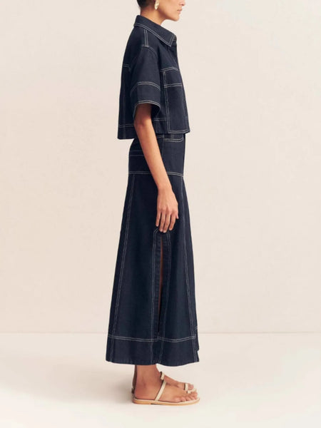Cropped Short Sleeve Contrast Stitch Denim Top