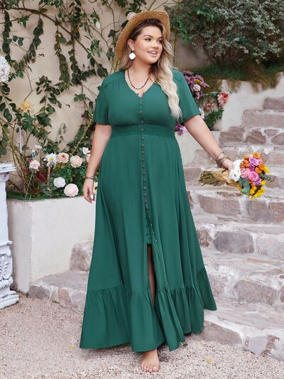 Plus Size Button Detail V-Neck Short Sleeve Maxi Dress