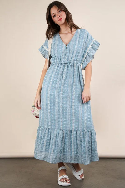 An embroidered boho ruffled midi dress is a stylish piece that combines intricate stitching with flowing ruffles in a medium-length silhouette. This dress embodies a bohemian aesthetic with its detailed embroidery and playful ruffle accents. Perfect for casual or dressy occasions, it offers a chic and unique look for those who love bohemian-inspired fashion.