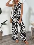Devine Printed Round Neck Sleeveless Tie Waist Jumpsuit