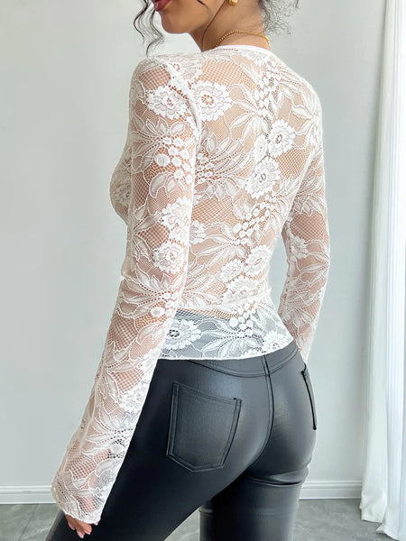 Lace Deep V-Neck Long Sleeve T-Shirt