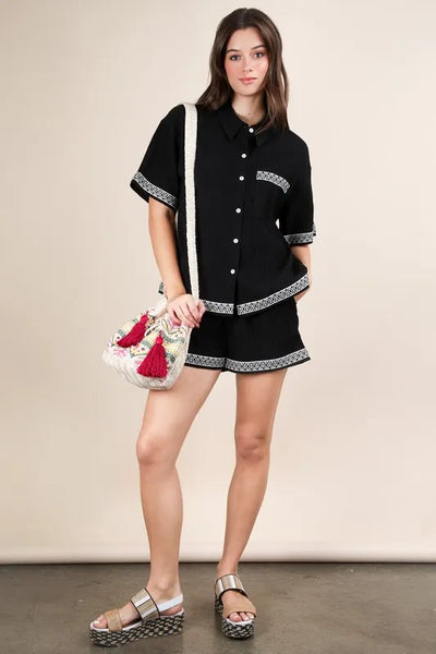 The crinkled woven shirt top and shorts set is a versatile and stylish outfit choice for casual days or summer events. The crinkled texture adds a unique touch to the woven fabric, giving it a relaxed and laid-back vibe. This matching set offers an effortless and coordinated look, perfect for staying cool and comfortable in warm weather.