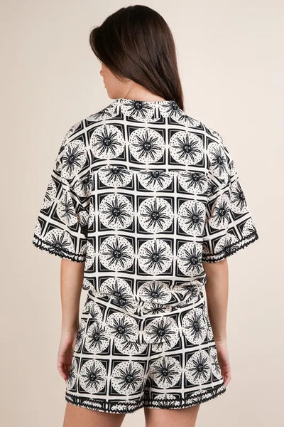 A tropical printed shirt top and shorts set is a stylish and coordinated outfit choice for warm weather. The vibrant print evokes a vacation-ready vibe, while the matching top and shorts create a cohesive and put-together look. This set is perfect for beach days, summer outings, or tropical getaways. Pair it with sandals and sunglasses for a trendy and effortless ensemble.