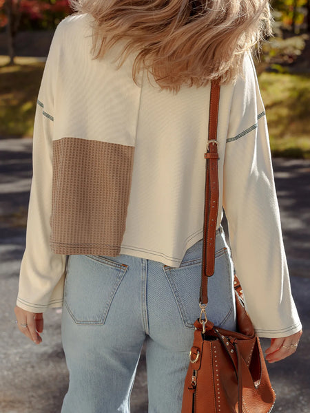 Color Block Waffle Knit Stitch Detail Long Sleeve Top
