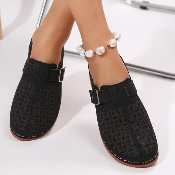 These elegant loafer mules combine comfort and style with their vintage-inspired design. Crafted from high-quality faux leather in a sophisticated sage green shade, featuring intricate hollow-out perforations for enhanced breathability. The adjustable buckle detail adds both functionality and aesthetic appeal. The slip-on design ensures easy wear, while the cushioned footbed provides all-day comfort. The durable rubber sole offers reliable traction. Perfect for both casual and semi-formal occasions, these mules pair well with jeans, skirts, or dresses.
