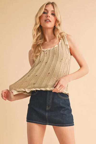 A distressed detail round neck knit tank is a stylish top that features a round neckline and a knitted fabric with intentionally frayed or ripped areas for a worn-in, edgy look. This type of tank top combines the comfort of a knit fabric with a trendy distressed design, adding a touch of uniqueness to your outfit. It can be dressed up with a skirt and heels for a chic, casual look or paired with jeans and sneakers for a more relaxed vibe.
